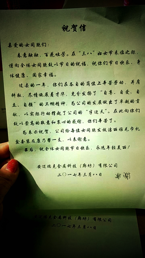 这些美丽、勤劳、善良的女员工发挥着各自的才华和智慧,她们以自己的实际行动撑起了公司的“半边天”, 公司的发展离不开她们的辛勤付出。在这个特别的日子里,公司为每位女员工准备了节日礼品及祝贺信,体现了公司对女员工的关爱和尊重。